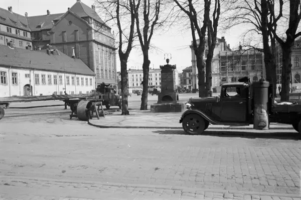 Kristian Frederiks plass med Paléhagen. Strandgata mot Østbanen. Havnegata nærmest. Paleét til venstre. Minnesmerke over Mathia Anker (Bernt Ankers hustru), laget av C.F. Stanley (avduket 1803). Reist i Paléhagen, senere flyttet til nordsiden av Oslo Bymuseum. Lastebil med knottbeholder.