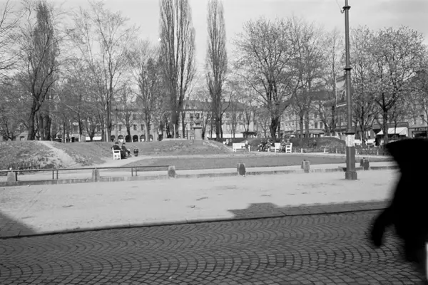 Olaf Ryes plass. Park. Parkbenker. Parktrær. Mathias Skeibroks portrettbyste i bronse av presten og sosialforskeren Eilert Sundt. Sofienberggata nærmest.