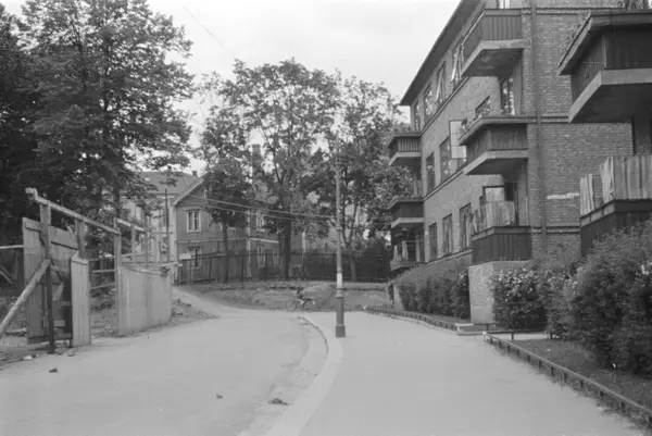Briskebyveien mot Løvenskiolds gate. Husett midt i bildet, en av trehusene som var igjen fra den gamle trehusbebyggelsen. Ble sanert når Briskebyveien ble forlenget mot Løvenskjolds gate. Boligene til høyre inngår i boliganlegget Langgaardsløkken. Gamle transformatorstasjonen, hvor Restaurant Bølgen & Moi holder til i dag, står der hvor plankegjerdet er i bildet.