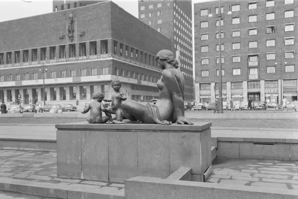 Fra Rådhusplassen. Per Hurums bronseskulptur forestillende kvinne med lekende småbarn, fra 1955. Tørrlagt østre basseng. Parkerte biler foran Rådhuset og forretningsbygget ved Hieronymus Heyerdahls gate 1.