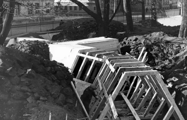 Bygging av dekningsgraver, beskyttelse mot flyangrep, bombeangrep. Gravearbeider i Tøyenparken ved Jens Bjelkes gate. Fra album "Dekningsgraver i arbeide for Oslo kommune". Fotografert ved befaring 23. mars 1940.