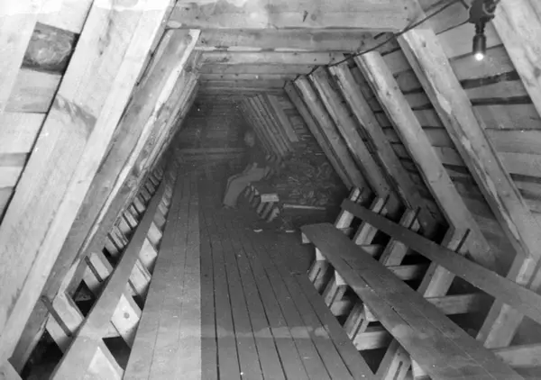 Interiør fra tilfluktsrom, dekningsgrav i park. Beskyttelse mot flyangrep. Mann på benk. Ukjent sted. Fra album "Dekningsgraver i arbeide for Oslo kommune".