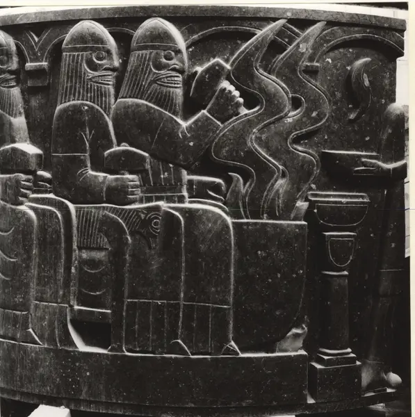 Tor ferdig hugget. Relieffet utgjorde en del av Eidsvollsøylen. Søylen er modellert av Wilhelm Rasmussen som et minnesmerke over medlemmene av riksforsamlingen på Eidsvoll 1814. Den ferdige søylen fikk aldri plass foran Stortinget som opprinnelig tenkt. Oppført i 1992 som Sagasøylen i Bøverdalen.