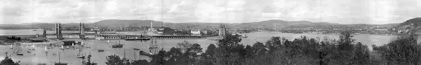 Forslag til Den internationale konkurrance om præmier for forslag til utvidelse av Kristiania Havn. Panorama fotografi over Oslo havn, seil-, damp- og motorbåter, bebyggelse i bakgrunnen, Motiv: fotografert fra hovedøya, påtegnet planer for brobygging til Hovedøya, fly i lufta m.m. Forslaget ble ikke en av de tre vinnerne, men en av tre inkjøpte planer. Forslaget var utarbeidet av Cauer, geheimer baurat, professor, Charlottenburg, I. Brix, geheimer regierungsrat, professor, Charlottenburg, Otto Dahl, avdelingsingeniør, Kristiania havneingeniørvæsen. 30 forslag kom inn.