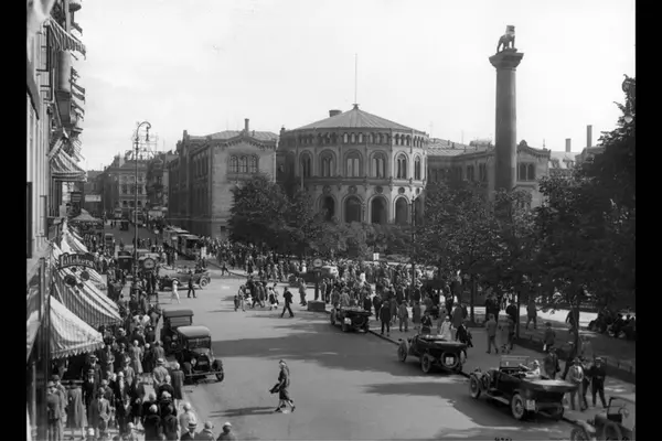 Folkeliv på Karl Johan, Eidsvollmonumentet (Eidsvollsøylen), fullskalamodell i papp, prøveoppsetting. Stortinget, biler, baldakiner, trikker. Søylen er utført av billedhugger Wilhelm Robert Rasmussen (1879-1965). Søylen oppført 1992 som Sagasøylen på Elveseter i Bøverdalen. http://no.wikipedia.org/wiki/Wilhelm_Rasmussen