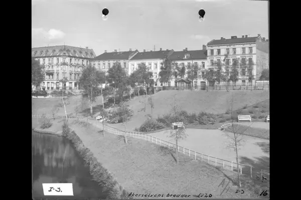 Parkanlegg med gangveier, sittebenker og nyplantinger av trær nedenfor Søndre gate.Th.Kittelsensplass og Søndre gate langs bebyggelsen oppe til høyre. Hele parkanlegget på Østre side av Akerselva i sin nye fase.