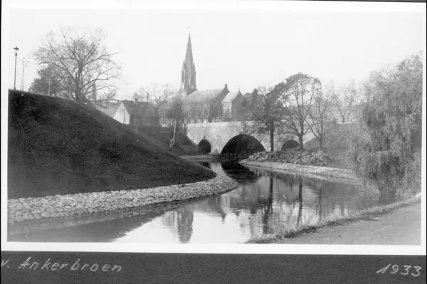 Akerselva belagt med naturstein langs begge sider av elva.Grønt parkbelte med trær og busker på høyre side av elven. Venstre elveskråning, nyopparbeidet og jordbelagt for grøntanlegg. Brua med Jakobkirken i bakgrunnen. Det lille huset til venstre for brua holdt Nana Broch og Østkantutstillingen (1928-1956) til.