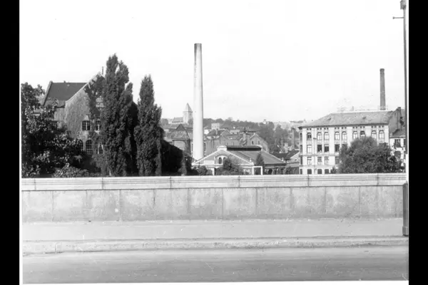 Ankerbrua (Akerselva) med elektrisitetsverkets sekundærstasjon (transformatorstasjonen) til venstre i bildet. Bygningene er oppført mellom 1898 og 1948. Fabrikkbygningen midt i bildet oppført 1896 for tekstilfirmaet A/S Indigo i Nedre gate 7. Gamle Aker kirke i bakgrunnen, til venstre for fabrikkpipa. Til høyre kontor- og industribygg mellom Øvre og Nedre gate.