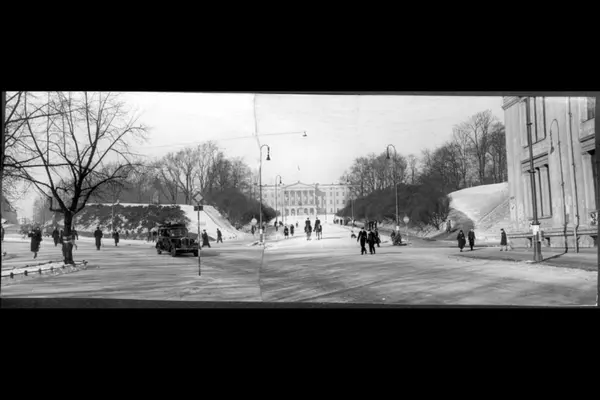 Krysset Karl Johans gate, Frederiks gate og Henrik Ibsens gate (Drammensveien) mot Slottsparken med store plener under høye trær, gangveier og alléer. Abelhaugen, med monumentet over Nils Henrik Abel, til venstre. Nisseberget til høyre. Slottsplassen med Det Kongelige Slott bak. Vinterstid med barn som aker og ridende Politi ned langs Slottsbakken. Bil og mennesker i gatene. Universitetsbygningen i høyre biledkant.
