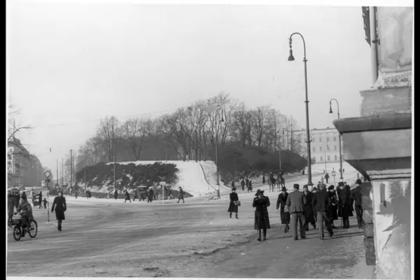 Krysset Karl Johans gate, Frederiks gate og Henrik Ibsens gate (Drammensveien) mot Slottsparken med Abelhaugen i bildet. Slottsplassen med det kongelige slott til høyre. Ridende Politi ned Slottsbakken. Mennesker i gatae en vinterdag. Sykkelbud ned Karl Johans gate. Arbeidere med lastebil i gang med beskåring av Abelhaugens sørside.