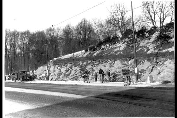 Abelhaugen i slottsparken en vinterdag. Arbeidere med lastebil i gang med beskåring av Abelhaugens sør- vestre side mot Henrik Ibsens gate (Drammensveien). Langsgående fortau, skiltet med: Benytt fortauet på andre siden. To syklister iaktar arbeidet (Sykkelbud). Slottsparken.