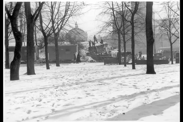 Slottsparken mot Abelhaugen en vinterdag. Arbeidere i gang med utskjæring av Abelhaugens sør-vestre side mot Henrik ibsens gate (Drammensveien), hvor en busspasserer. Mobile arbeidsbrakker på hjul plassert langs gangveien inn mot parken. Kuppelen til Nationalteateret i bakgrunnen. Til høyre Torstedgården i Stortingsgata 30. På siden skimtes de gamle bygningene langs Ruseløkkveien.