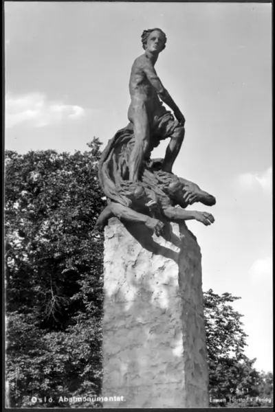 Gustav Vigelands bronseskulptur av matematikeren Niels Henrik Abel, avduket 1908 i det sydøstre hjørnet av Slottsparken som senere ble kalt Abelhaugen. Monumentet har gitt haugen navn. Postkort 9511. Harstad´s Forlag