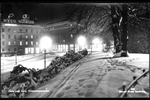 Vinterkveld med skispor over Abelhaugen. Henrik Ibsens gate snøbelagt i gatebelysning. Bygården til venstre (Før Drammensveien 2, bombet under krigen) med lysende reklame for Nyco fruktsalt og Globid. Fasaden skiltet med bl.a Hotel Parkheimen, J. Ødegaard, Odin, Liv-Brage og Parkstova. Til høyre Glitne gården. Vinterstemning. Pospektkort 860. Grans Kortforlag.