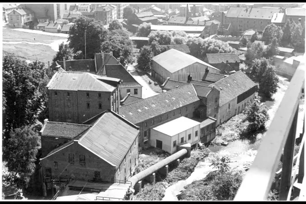 Bildet tatt sydover fra Oslo Lysverkers store gassklokke, som lå på det lille neset i Akerselva kalt Kuba. I forkant ses Nedre Foss mølle med driftsbygniger (merk:fikk i 1939 et turbinanlegg på 700 hk) og hovedbølet på Nedre Foss gård. Til venstre Grünerhagen og nedre del av Nordregate, med deler av trehusbebyggelsen Ny York, mot Grünerbrua (mellom trærne). I høyre billedkant ses de gamle bryggeribygningene (Christiania Bryggeri) som Nora Mineralvannfabrikk holdt til. I dag Byantikvaren og Byarkivet. Til venstre for bygningene ses Brenneriveien med industribygninger.
