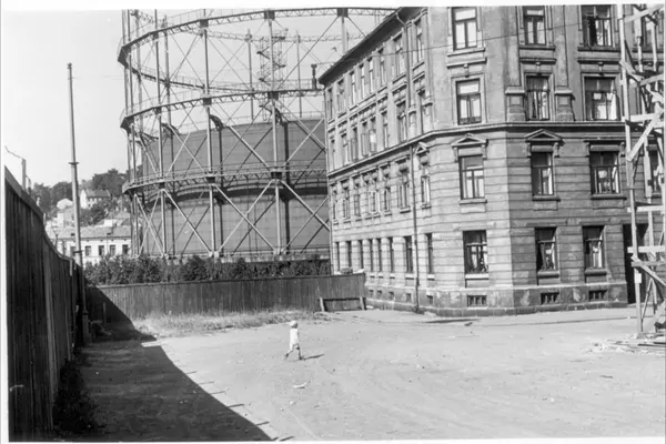Grüner gate langs og til plankegjerdet. Marselis' gate inn fra høyre med bygården (leiegårdskompleks) Marselis' gate 26 (gården i elva) et trefløyet anlegg i fire etasjer og med to underetasjer mot og helt inntil Akerselva. I dag parkbelte. Oslo Lysverkers store gassklokke ruvende bak.