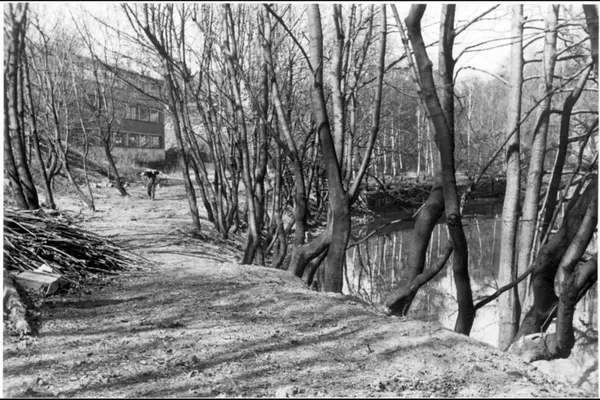 Hugging, beskjæring og opparbeidelse av turvei langs Akerselvas vestre bredd, fra gassklokka ved Nedre Foss mølle (Kuba) og nordover. Oslo Lysverkers transformatorverksted og lager oppe til venstre i billedet.
