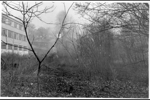 Parkvesenets planlegging av trasé for turvei langs Akerselvas vestre bredd, nordover mot Schultzehaugen i bakgrunnen. Oslo Lysverkers transformatorverksted og lager til venstre i billedet.