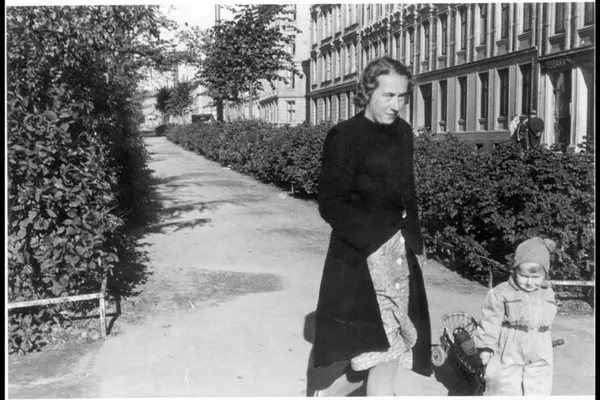 Mor med barn på gangvei langs Grünerhagen. Fra Nordre gate i syd og nordover, med Fossveiens endeløse bygårdsrekke til høyre i bildet. Frukt og tobakkbutikk i gården. Sannert til fordel for bolig og forretningskomplekset Grünerbygg (1979).