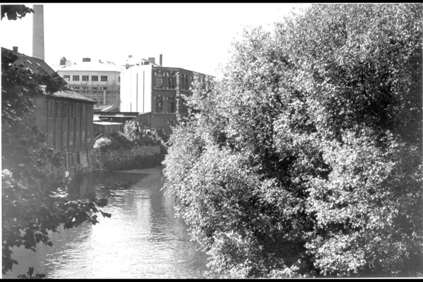 Akerselvas sydgående løp fra Grünerbrua.Trehuset til venstre (Østre bredd) er Stolmaker Engebretsens hus i Nedre gate 3. Industribygget merket med Centrum Trykk er Nedre gate 5 ( oppført 1899). Kristiania Fag- og Forskole for Håndverk og industri (nå Elvebakken skole) i bakgrunnen.