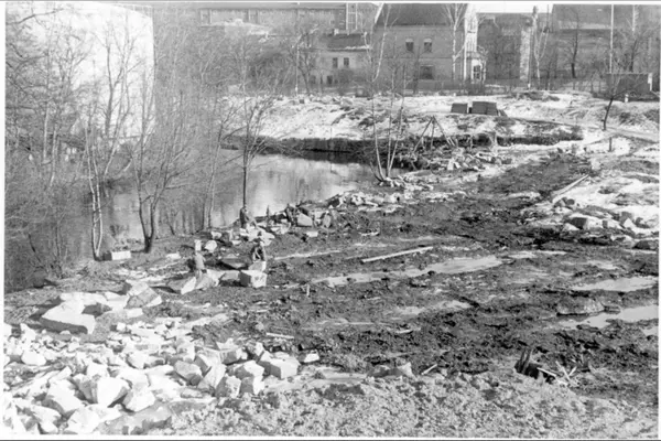 Arbeidere i gang med steinlegging og opparbeidelse for parkbelte langs Akerselvas vestre bredd. Løftebukk for stein. Bakgrunnen midt i bildet ses møllermesterboligen til Bjølsen Valsemølle. Til venstre lagertank tilhørende De Norske gjær og spritfarikker (Idun). Ved Treschows bru.