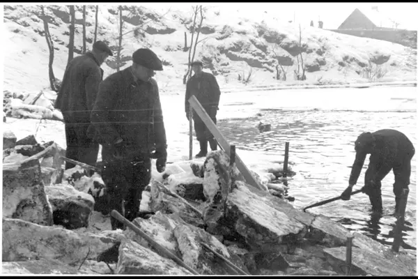 Fire arbeidere i gang med steinlegging av Akerselvas østre bredd nord for Beierbrua en kald vinterdag. Bak brua, i høyre hjørne, ses Hønselovisas hus (mesterbolig for Vaaghalsens Stampemølle).