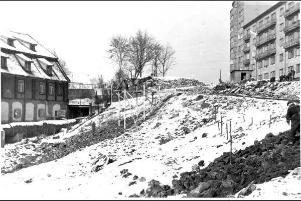 Opparbeidelse til parkområde på østsiden av Akerselva nordover fra Beierbrua mot Marcus Thranes gate. Verktøybrakke og arbeidere. Utstikkelse til turveier. Arbeider med trillebår dumber stein fra stillase. Blokkbebyggelsen er Sameiet i Sandakerveien 10 B. Til venstre Glads mølle (Nedre Papirmølle).Vinterstid.
