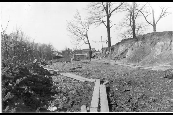 Opparbeidelse for parkbelte og turvei langs Akerselva. Stein/jord-massen trilles med trillebår på plank. Skinner for skinnegående vogner. Ved dagens Vøien bru, retning nordover.