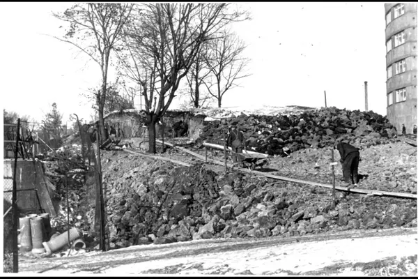 Arbeidere i gang med bryting av stein og gjennomskjæring av fjellknaus for turvei langs Akerselvas østre bredd nordover mot Marcus Thranes gate (Vøienbrua ikke oppført). Til høyre Sandakerveien 10b. I front nedfartsvei til elva.