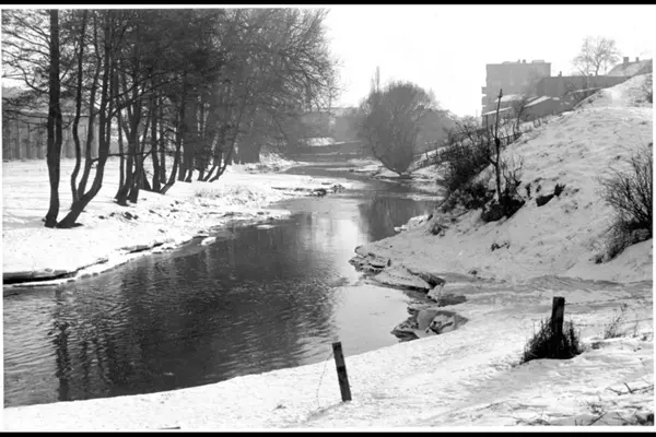 Akerselva en vinterdag sydover mot dagens Vøienbru. I venstre billedkant ses Myrens verksted. På vestre elvebredd trehusbebyggelsen i Maridalsveien med murblokka i Griffenfeldts gate 12 i bakgrunnen. Uopparbeidet parkområde. Påskrift bak på album Bentsebrua - Marcus Thranesgata.