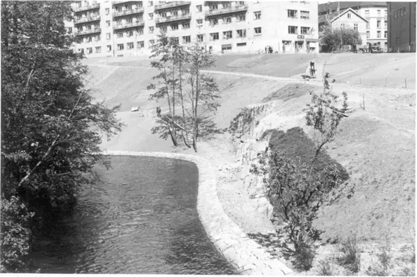 Arbeidere fredigstiller parkanlegget langs Akerselvas østre bredd fra Beierbrua og nordover mot Marcus Thranes gate. Steinlagt elvebredd mot Glads mølle.Blokkbebyggelsen i Sandakerveien 10 B med butikk skiltet Tobakk-Frukt (Tidemanns tobakk). I høyre hjørne Sandakerveien med Sagene skoles gymsal og hjørnegården i Holsts gate 2 (Oskar Braaten).