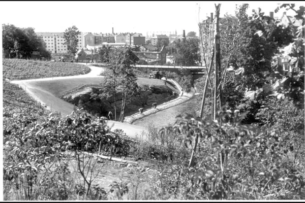 Akerselvas parkbelte på Østre elvebredd sett nordfra ved Vøienfallene. Arbeidere ferdigstiller parkområdet. Beierbrua med Graahs spinneri og Hjula veveri til høyre. Like bak brua ses rivingen av Foss bryggeri (1960 tallet). Bakenfor ses Foss skole.