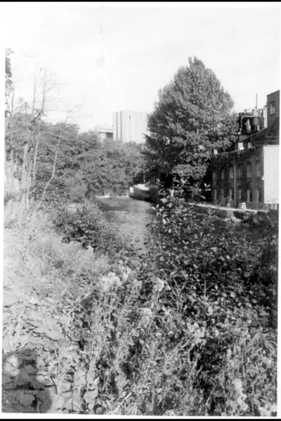 Uopparbeidet elvebredd nordover langs Akerselvas vestre bredd, fra Treschows bru, mot kornsiloen til Bjølsen valsemølle i bakgrunnen. Til høyre i bildet ses De norske gjær og spritfabrikker (Idun).