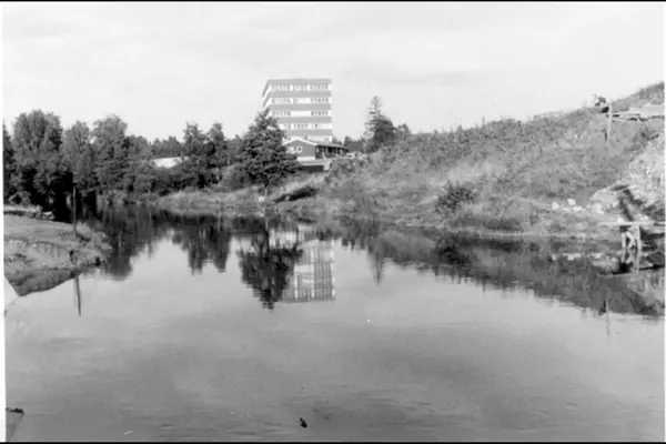 Akerselva sett nordover og på sørsiden av Kjelsåsveien der veien krysser elva ved Stilla.Bygningen midt i bildet er Kjelsåsveien 160, såkalte Stilla-torvet. Badebrygge på østre elvebredd.