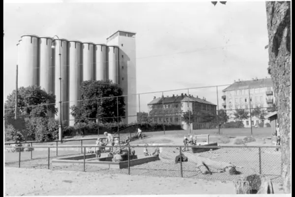 Ballplassen ved Fossveien, en del av Grünerhagen, med kornsiloen til Nedre Foss mølle, Marselis' gate 26 midt i bildet og nr. 27 til høyre. Barnepark med lekende barn.