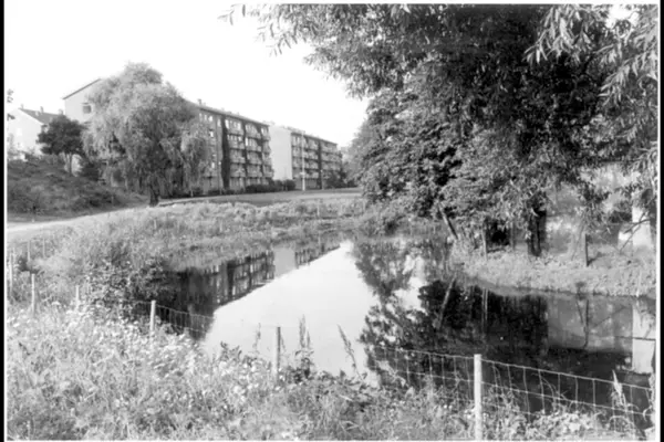 Akerselva nordover langs elvas vestre bredd mellom Treschows bru og Badebakken. Bebyggelsen i Mor Go'hjertas vei. Grøntområde og naturlig vegetasjon med ståltråd-gjerde langs elvebredden. Småbebyggelse på elvas østre bredd.