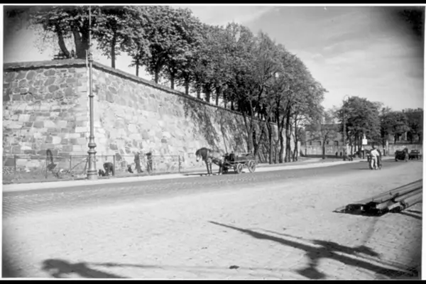 Kongens gate fra Akershusstranda. Hest og vogn. Arbeidere mellom Prins Carls bastion og Havnebanens spor. Siluett av båtmaster fra Vippetangkaia. Mennesker og kjøretøy ved Normandieplassen. Gatebelysning. Bildet er tatt etter Kongens gates forlengelse til brygga i 1922.