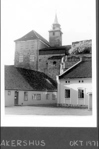 Fra festningsporten ved Kongens gate sett vestover med vaktstuen til høyre og barakkene ved jomfrutårnet, ved Munkedammen like ved Prins Carls Bastion. Akershus slott, fra venstre sydfløyen, Blåtårnet (klokketårnet), Våghalsen (over ses garderoben) og Fadeburgalleriet til høyre. Bildet tatt i oktober.