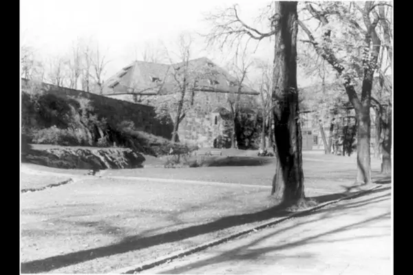 Festningsparken og Karpedammen med grøntanlegg, gangvei og trær. Det lange røde hus (1774) til høyre i bildet. Midt i bildet Skarpenords kruttårn (Sortieporten) med indre steinvoll som strekker seg sydover. Bildet tatt i oktober.
