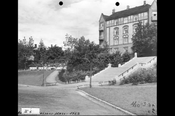 Parkanlegget mot nordøstlige delen ferdig anlagt (1919-1921) med trappen, gangveier, nybeplantninger, hvite sittebenker med steinhagen og den grusbelagte plassen. Professor Dahls gate 35 til høyre og trevillaen (Sveitervillaen) nr. 37 til venstre der Fearnleys gate munner ut. Professor Dahls plass frem til 1934. Uoffisielle betegnelsen Vestkanttorget.