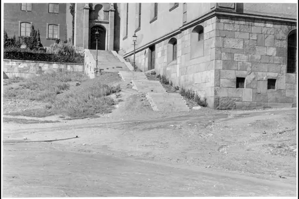 Svenska kyrkan i Oslo (1925) ovenfor Hammersborg torg. Bildet tatt i fra den opprinnelige plassen (torget) som lå rett foran kirken. Bygging av trappegang og opparbeidelse etter store terrengmessige endringer på Hammersborg.
