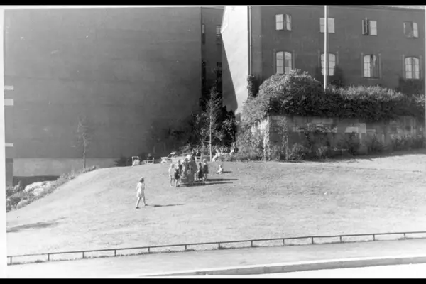 Veggfasaden til Deichmanske bibliotek og Annekset med velferdslokaler og boliger for Margaretakyrkan (Den Svenska kyrkan i Oslo). Grøntområde (før bibliotekets østfløy ble påbygd) med lekende barn, og murterrassen med flaggstang til kirken. Fra gamle Hammersborg torg(Grubbegata).