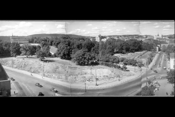 Bildet tatt i fra Odd Fellow-bygningen og nordover mot Slottsparken med Slottet til venstre. Abelhaugen ses sterkt beskåret på sørsiden da Drammensveiens løp ble endret. Slottsbakken med Nisseberget i bakgrunnen. Frederiks gate til høyre. Midt i bildet ses funkisbygget i Wergelandsveien 5, bygget i 1930. Sammensatt bide.