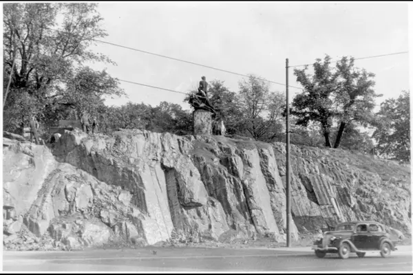 Fra 7. Juni plassen mot Abelhaugen og Abelmonumentet. Arbeidere ståendes på knausen til venstre i bildet. Bil opp Henrik Ibsens gate (Drammensveien). Lyktestolpe med strømkabler. Slottsparken.