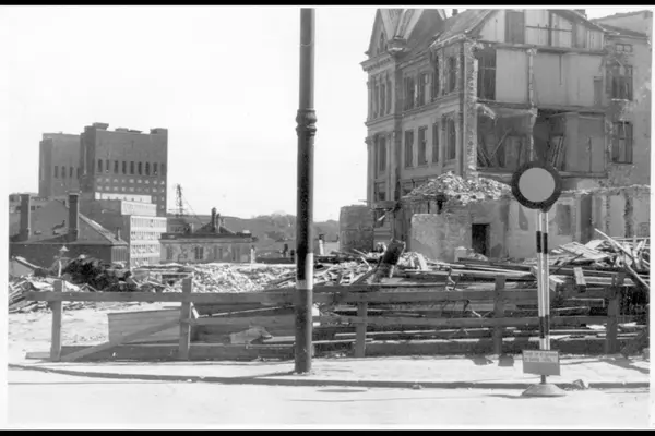 Ruinene av leiegården i Drammensveien 2 etter britenes mislykkede flyangrep mot Victoria terrasse nyttårsaften 1944 (UD-bygningen oppført i 1963-64 på plassen). I bakgrunnen bolighusene i Ruseløkkveien og Rådhuset. Forbudskilt merket "stengt for all kjørende, kun tjenestekjøring", plassert ved Drammensveien (nåværende Henrik Ibsens gate).