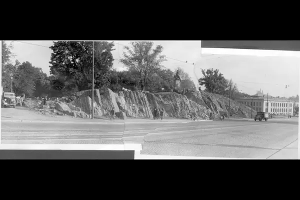 Fra Triangelplassen (7. juni plassen) og nordøst-over Drammensveien mot Abelhaugen og Slottsparken. Arbeidere i aktivitet med opparbeidelse over hele haugen. Lastebil, hest og vogn, luftkompressor. Universitetet i høyre hjørne. Bildet tatt 1949 - 50. Sammensatt bilde.