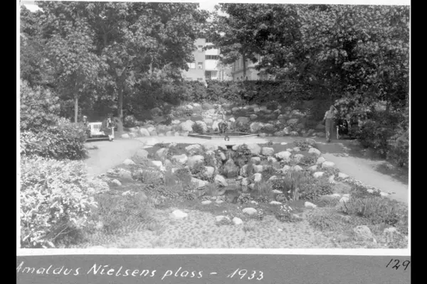 Steinhagen med beplantning, to damer på hvit benk, gangveier og Fontenegruppen "Gutten på delfinen". I bakgrunnen skimtes Professor Dahls gate 33, bued boligblokk i funkis. Plassen het tidligere Professor Dahls Plads (Professor Dahls Plass). Uoffisielle betegnelsen Vestkanttorget.