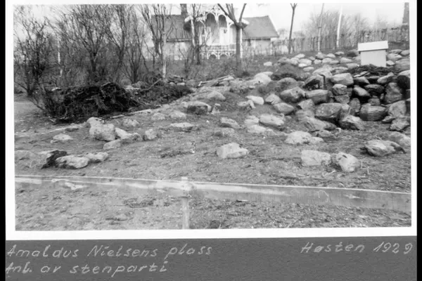Anlegging av steinhagen som ligger øst i parken. Kranhus for tilkobling av vann til fontenen. I bakgrunnen ses sveitservillaen i Professor Dahls gate 37 (1878). Bildet tatt om høsten. Professor Dahls plass, Vestkanttorget.