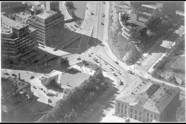Flyfoto over vestre del av Studenterlunden (med nåværende Johanne Dybwads plass) med Nationaltheatret og nedgangen til Nationaltheatret stasjon. Stortingsgata med tilstøtende gateløp, fra venstre Olav Vs gate (dengang Roald Amundsens gate), Munkedamsveien med Odd Fellow-bygningen og Torstedgården på hver sin side. Ruseløkkveien med 7. juni plass (Triangelplassen) bak. Drammensveien (nåværende Henrik Ibsens gate). Slottsparken med Slottsbakken og Abelhaugen. Frederiks gate, Karl Johans gate med Universitetet (Domus Bibliotheca). W-36821