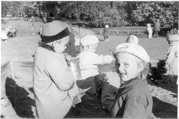 Nærbilde av små barn med bøtte og spade i en sandkasse ved Tøyenhagen lekeplass. Ligger i den sydlige delen av Botanisk hage, på hjørnet av Jens Bjelkes gate og Tøyengata. Del av plassen med gangveien opp mot hagen i bakgrunnen. Barn og barnevogner. Bildet tatt 1937.